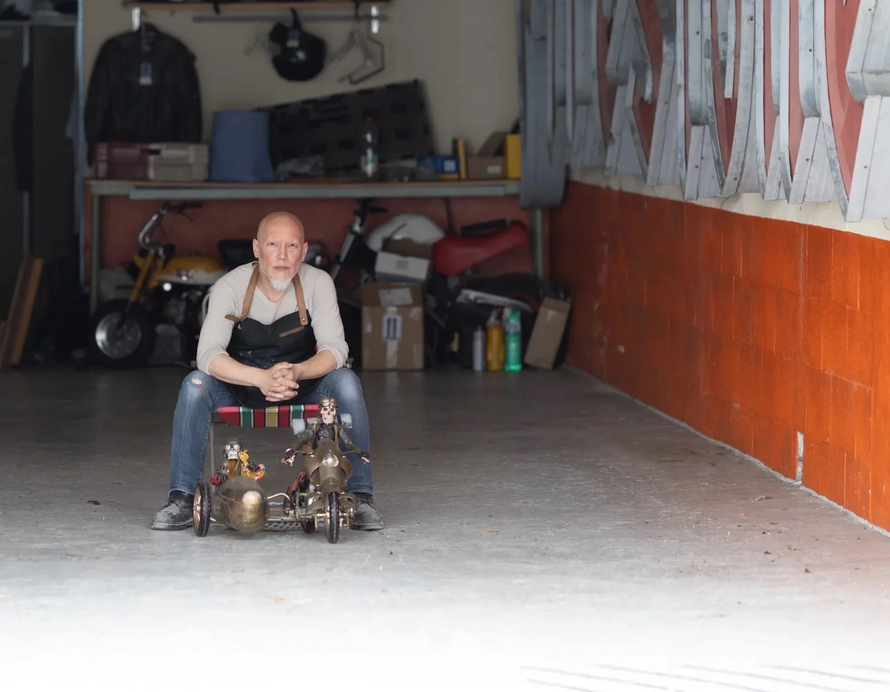 Every piece is made almost entirely from discarded material. Bicycle tubes. Cat food tins. Watch oscillators from Cartier, bought at scrap value. The upcycling is not a sustainable-art position. It is the internal logic of a post-collapse world that builds from salvage.